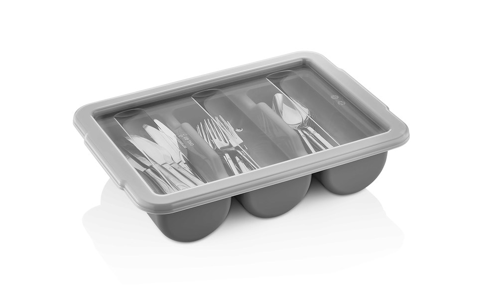 Емкость для столовых приборов (40*29*9,5 см) из полипропилена на 3 секции. Удобные ручки обеспечивают надежный хват. Возможность штабелирования экономит место при хранении. Подходит для мытья в посудомоечной машине. *Крышка в комплект не входит.